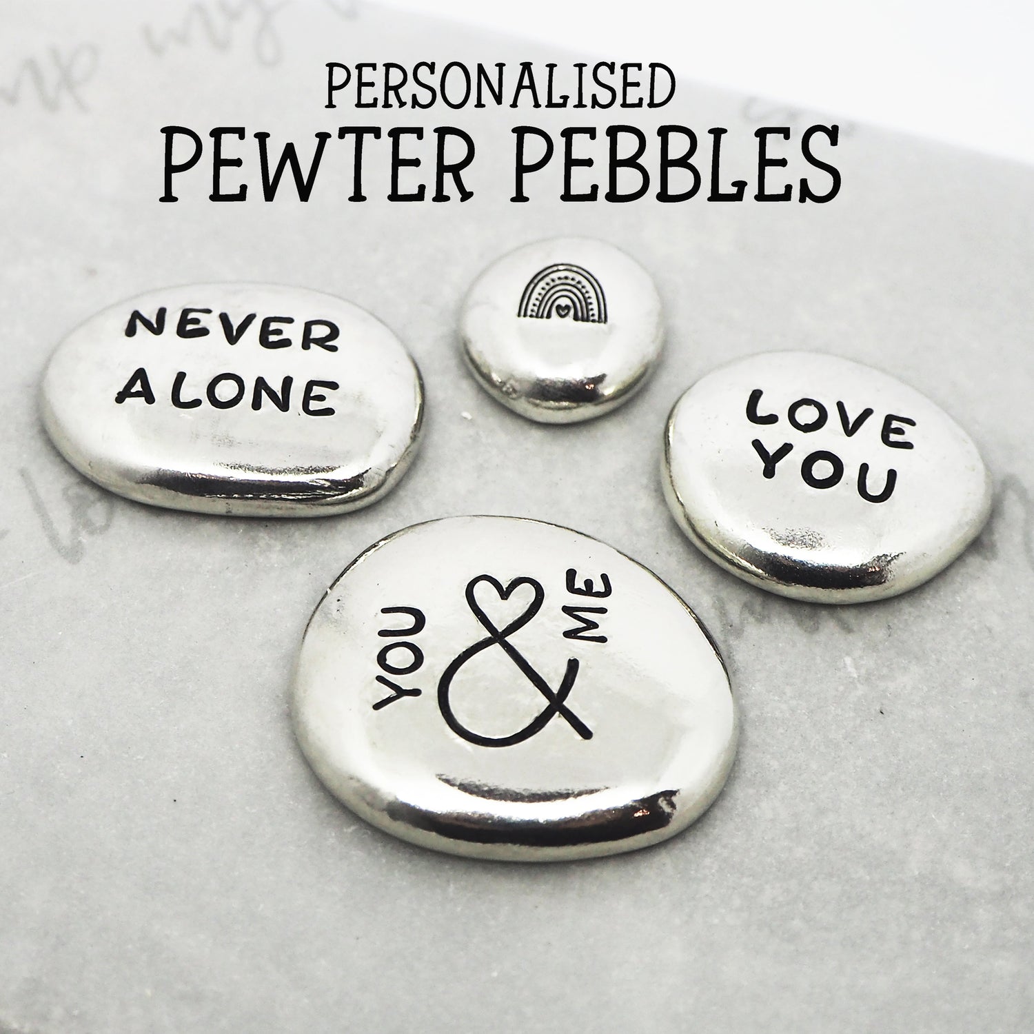Give a heartfelt keepsake with a handcrafted pewter pocket pebble, stamped with your personal message of love, inspiration, or encouragement. Each one is individually poured and hand-stamped, making it truly unique — just like the person receiving it.